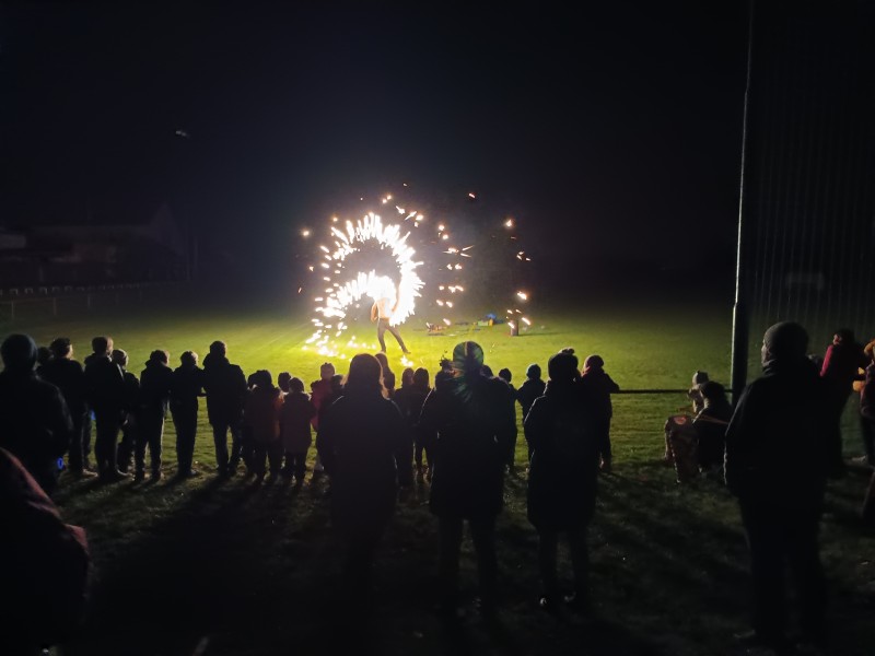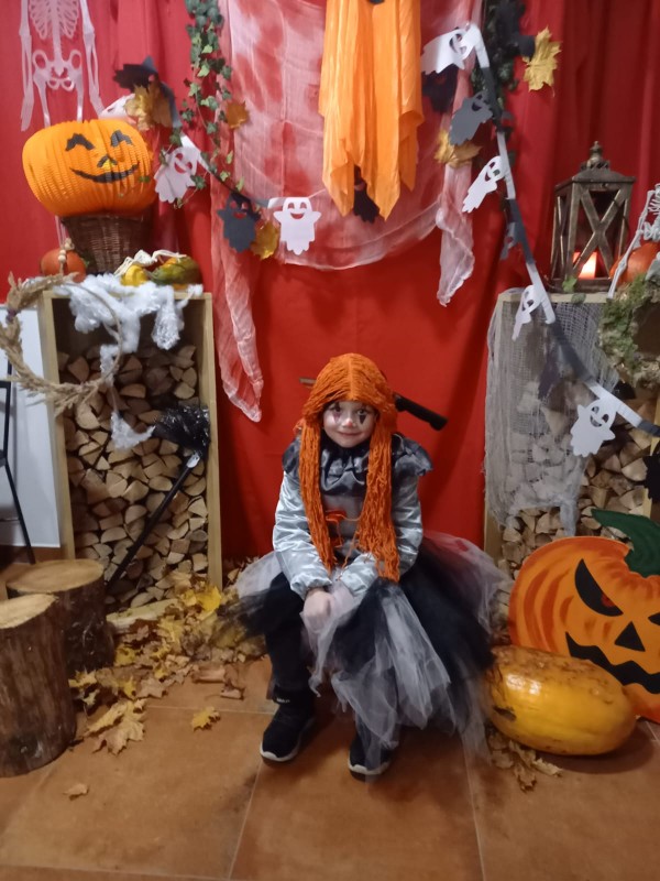 Na hřišti nás čekalo občerstvení a ohňová show. Největší aplaus si vysloužil pán, který doslova plival oheň! Nechyběl ani tematický fotokoutek s dýněmi a halloweenskou výzdobou.